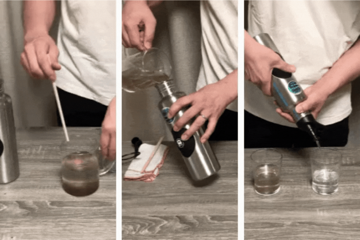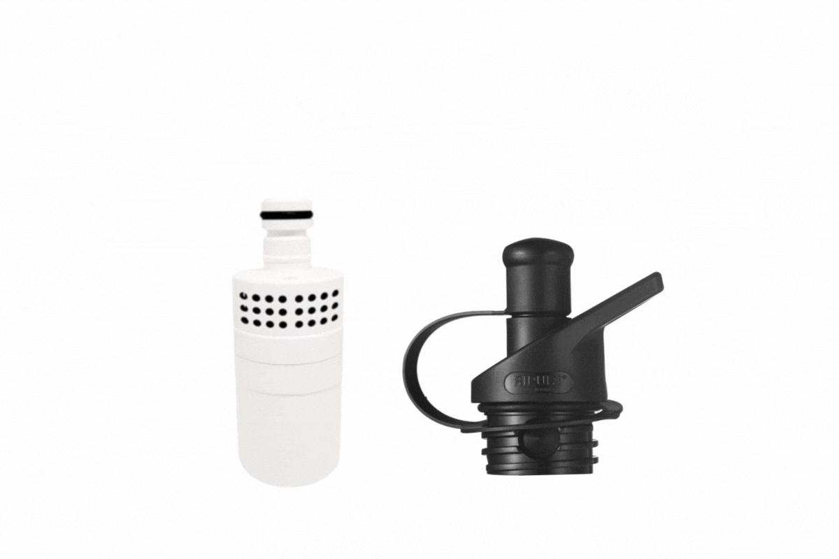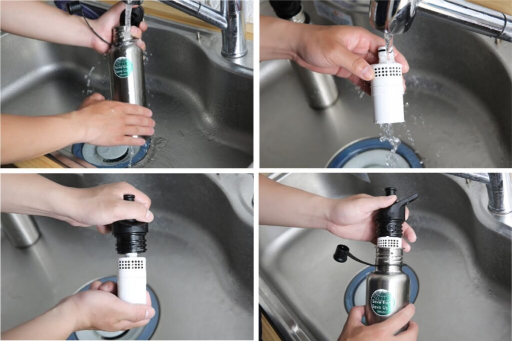 ノズルにフィルターをねじって差し込むだけで、どこにでも持ち運べる浄水ボトルの出来上がり。