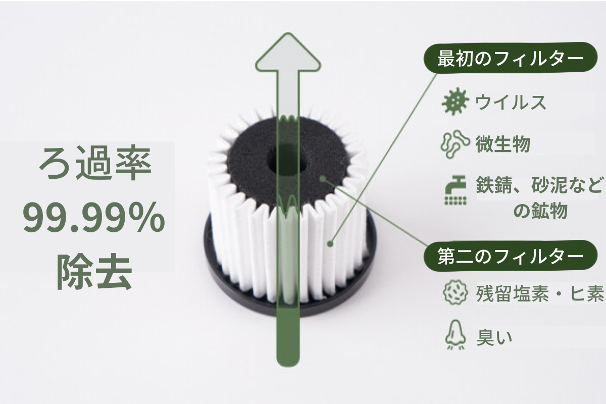 世界基準の水質検査をクリアしており、微生物・ウイルスを99.99%除去していることを示しています。