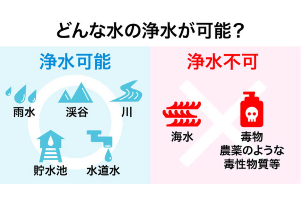 自宅の水道だけでなく、公園の水道や学校の水道、トイレの手洗い場の水道、さらには川の水や雨水までも綺麗な水にできます。