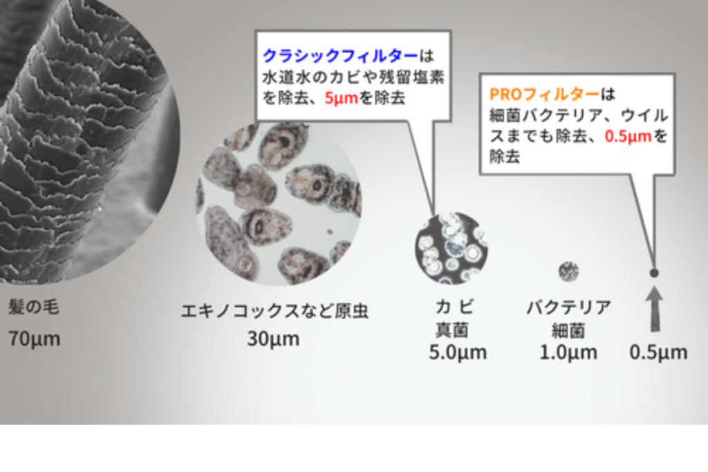 もう一つのフィルターは、水道水の残留塩素・水道管のカビ・錆による金属臭を99.99%除去するクラシックフィルター。